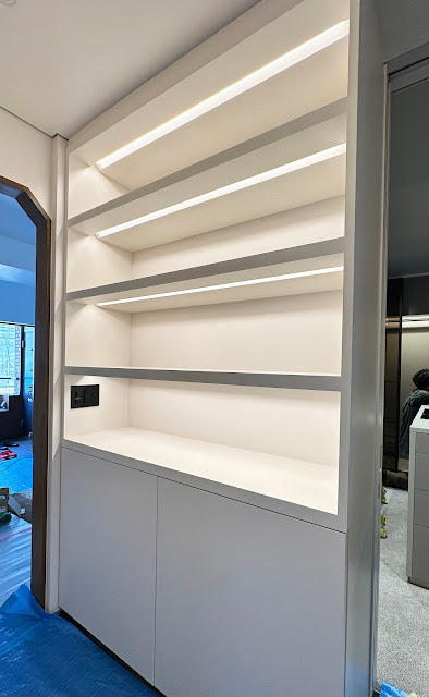 合わせて壁紙をリニューアル 一部は既存の扉など含めて塗装です。鎮座している業務用キッチンは撤去などは出来ないので板なので一部カバーしてインテリアの一部として取り込みしました。他、ミラーやロールスクリーンやシューズラックなど納品しました。